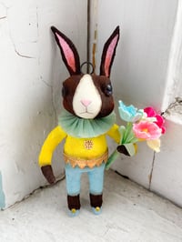 Vintage/antique inspired bunny spun cotton holiday ornament by Arbutus Hunter. Head turns for more posing options and has glass eyes. Wears a vintage crepe paper ruffled collar. Aged for a time-worn appearance. He's been created using century-old spun cotton techniques.